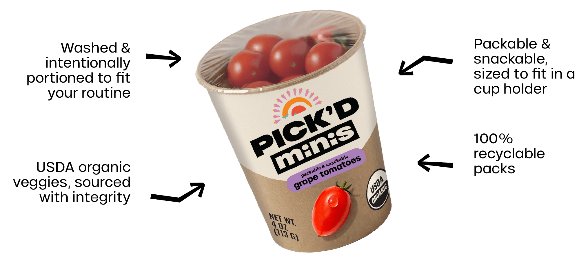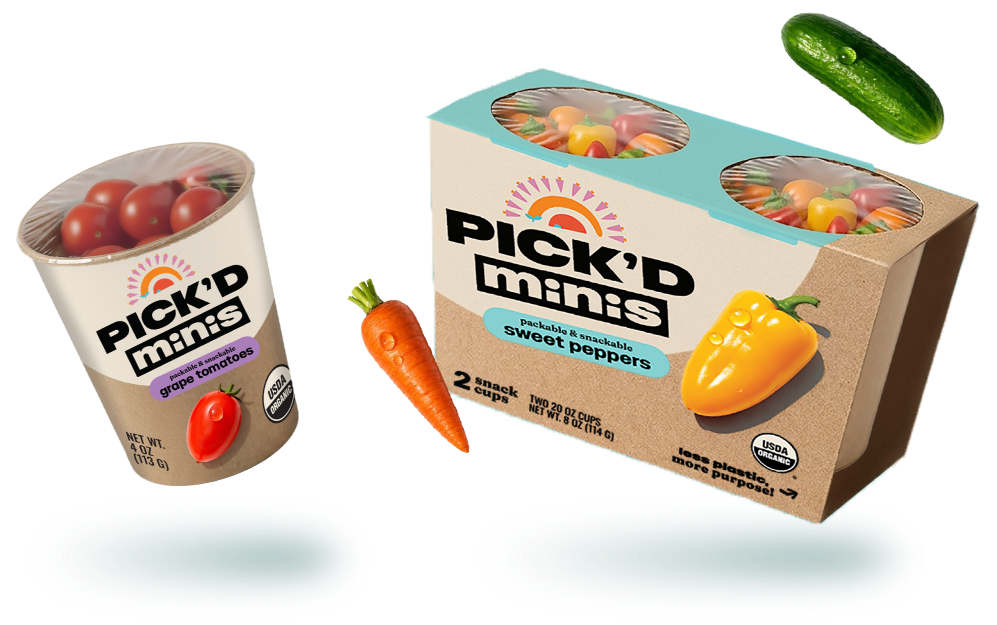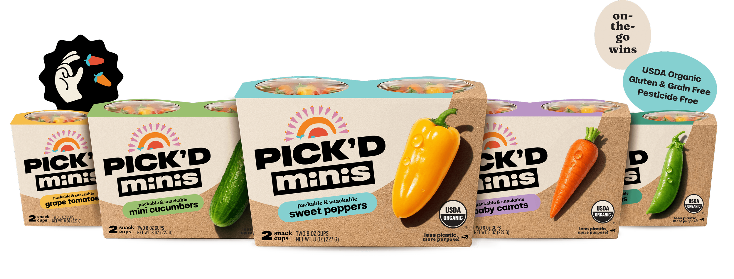 After 10 years tackling waste and freshness challenges in produce while juggling a busy family life, we saw firsthand the need for more convenient, wholesome snack options. We created Pick’d Minis to bring out produce expertise to veggie snacking and help fill a clear gap in the produce aisle.